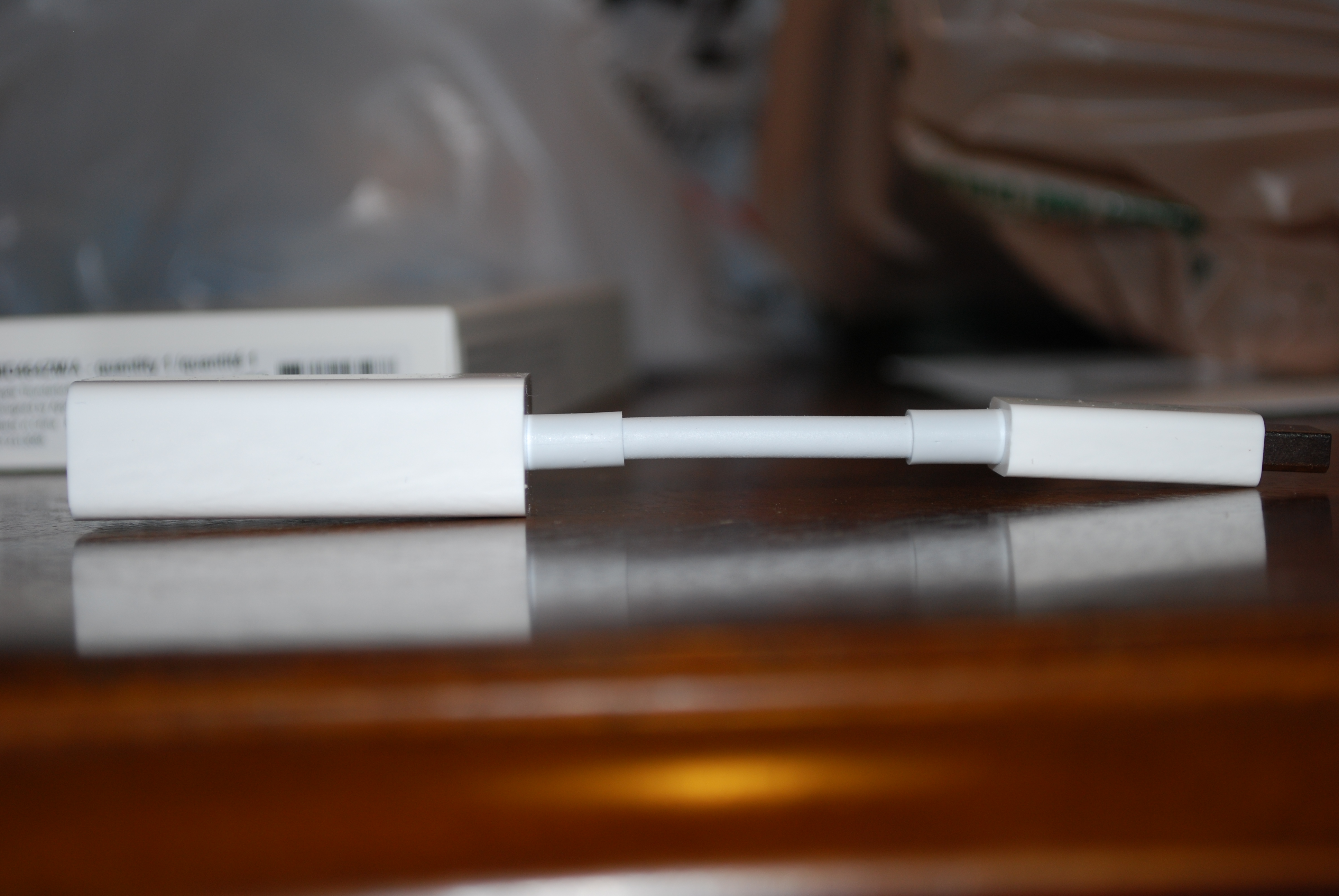 The cable wasn’t easy to find. I went to the Apple Store’s Mac accessory section, and found the Gigabit Ethernet Thunderbolt adapter quickly. No luck on the FireWire adapter. The store was packed, and it took flagging down multiple people to get some help.